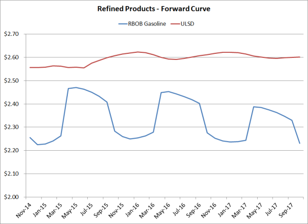 Taking a look at refined products, excluding seasonal peaks and valleys, the foward curve for both RBOB gasoline and ULSD futures indicates that the market consensus is for sustained, relatively low prices as well.